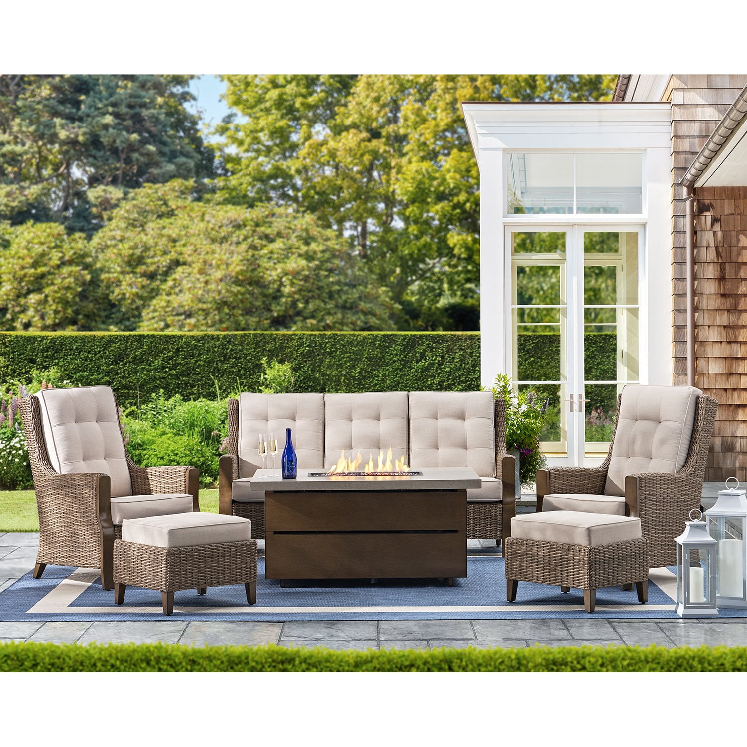- Includes: sofa, 2 deep seating chairs, 2 ottomans, fire pit coffee table, and weather-resistant covers, seats 5