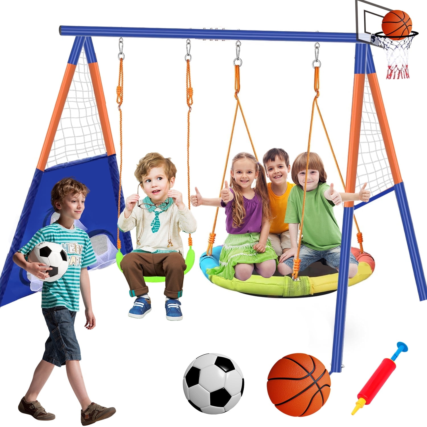 - Includes two sling swings with safe vinyl chain covers, flying saucer swing with reinforced inner webbing holds up to 2 kids and keeps them safely inside the saucer