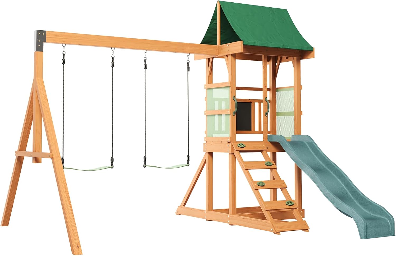SunSwell Wooden Swing Set with Wave Slide, Play Deck, Rock Wall Ladder, Belt Swings, Ch...