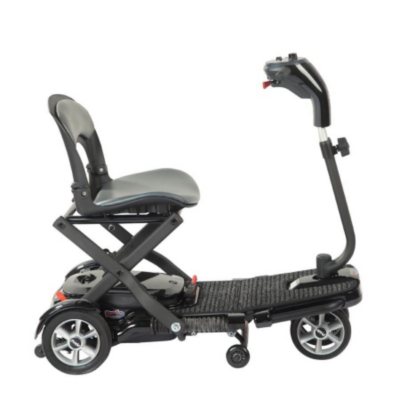 - Compact and foldable, gray vinyl-covered molded plastic seat