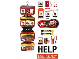 - Over 60 safety supplies and tools including first-aid items, a reflective safety vest and triangle, glow sticks, and a hand-crank flashlight that never needs batteries.