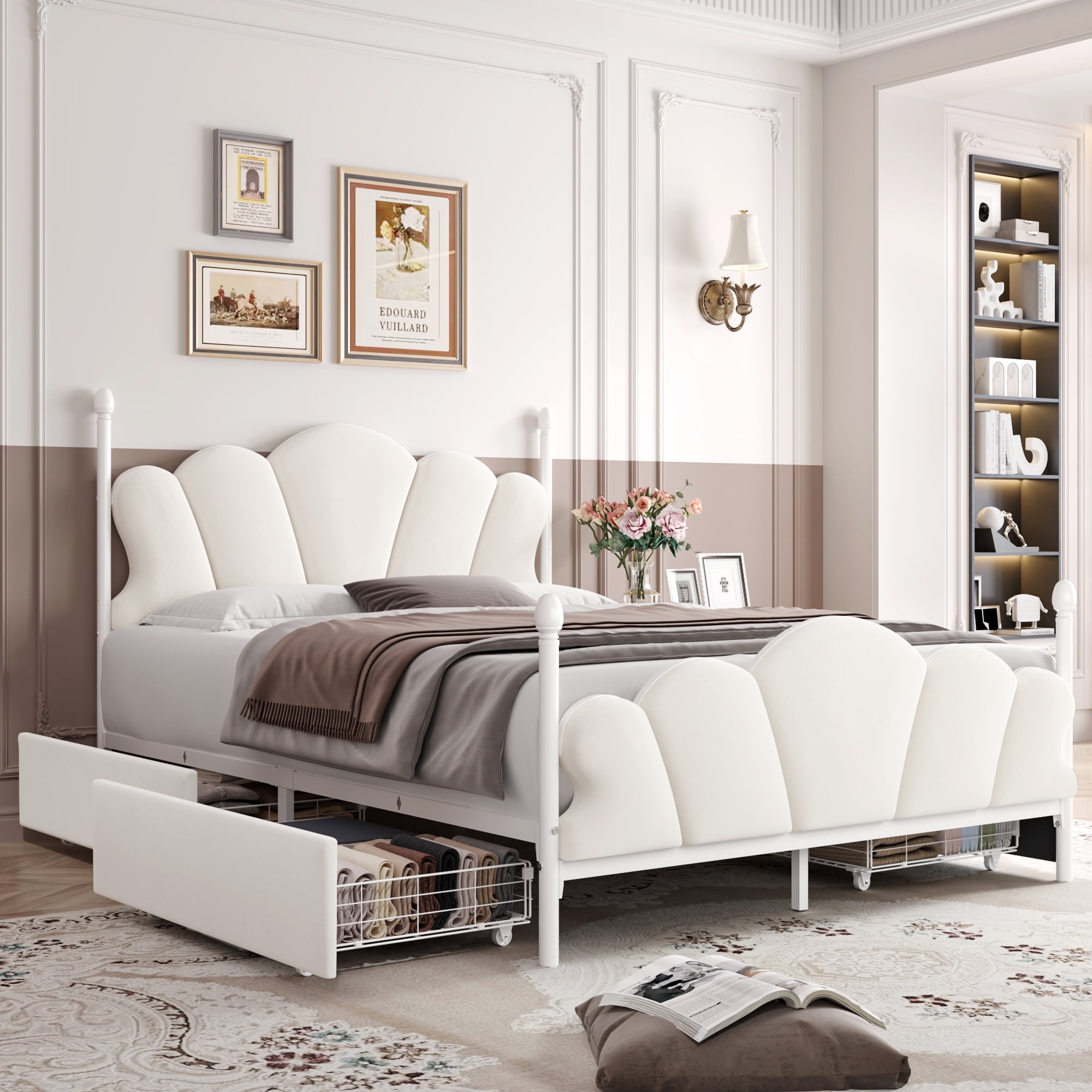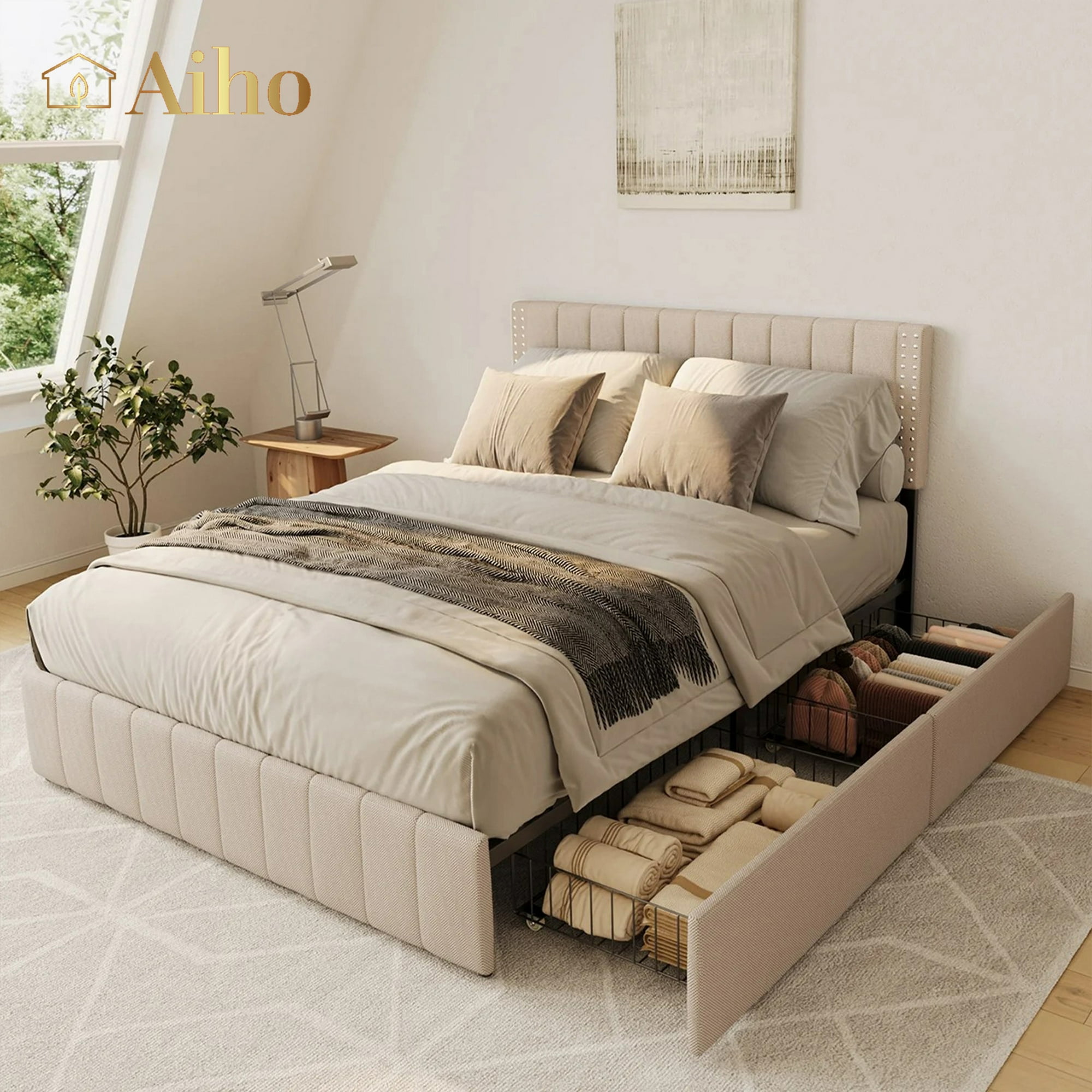Homfa Heavy Duty Metal Platform Velvet Upholstered Bed with 4 Drawer