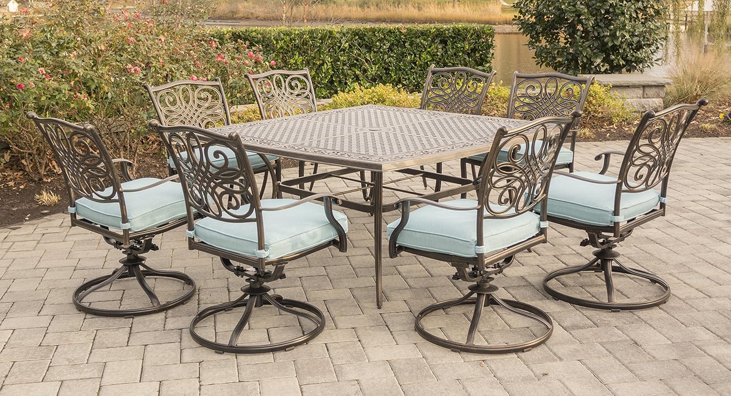 - Includes 8 stylish and cushioned swivel rocker chairs and 60″x84″ rectangle cast aluminum table