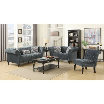 - Diamond-stitch button tufting, tapered legs, nailhead trim