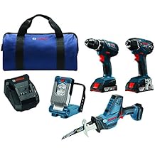 - Includes Bosch DDS181A Compact Tough 1/2 In. drill/driver, 25618 1/4 In. hex impact driver, GSA18V-083 reciprocating saw, GLI18V-420B work light, and two 18V 2.0 Ah SlimPack batteries.