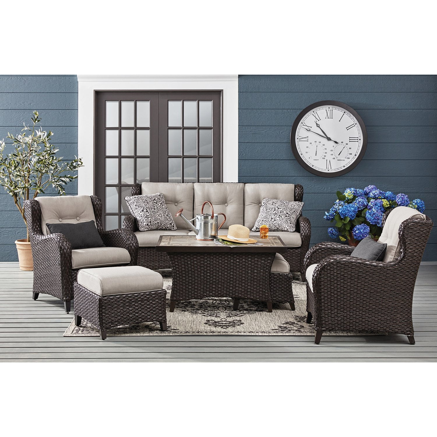 - Includes 30,000 BTU fire pit table with porcelain tile top, three-seat sofa, 2 chairs and 2 ottomans