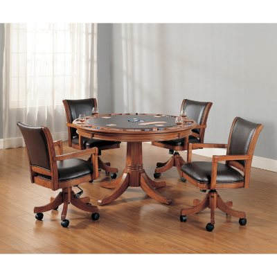 - Includes 1 table with solid surface on one side of table, gaming surface on other side of table and 4 chairs with tilt and swivel functions and caster wheels