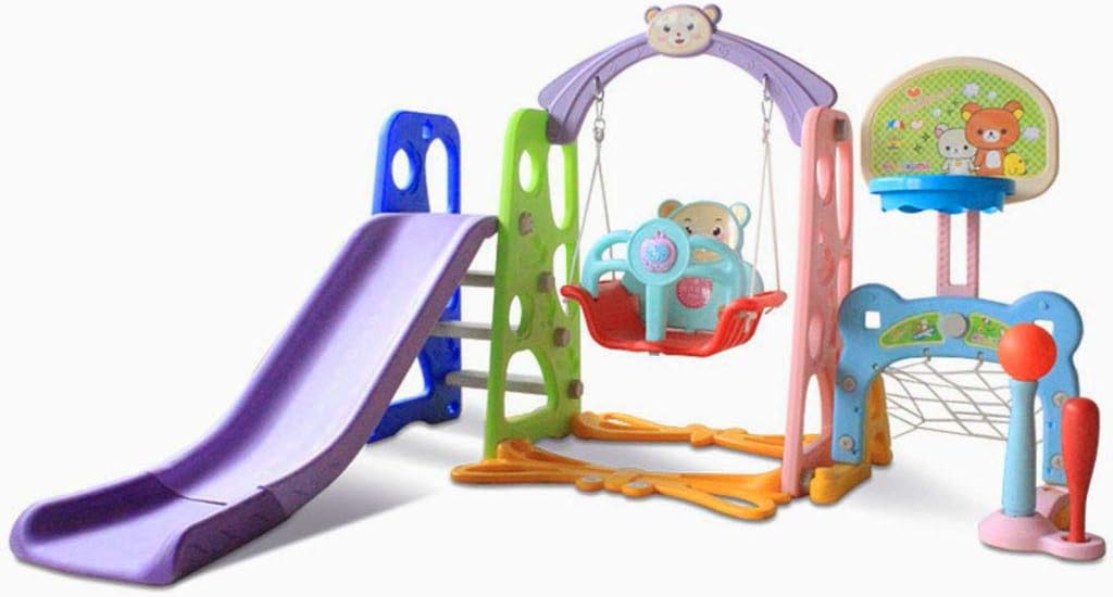 - 6-in-1 playing set with a smooth slide, a sturdy swing, a basketball hoop, a baseball, football goal and music