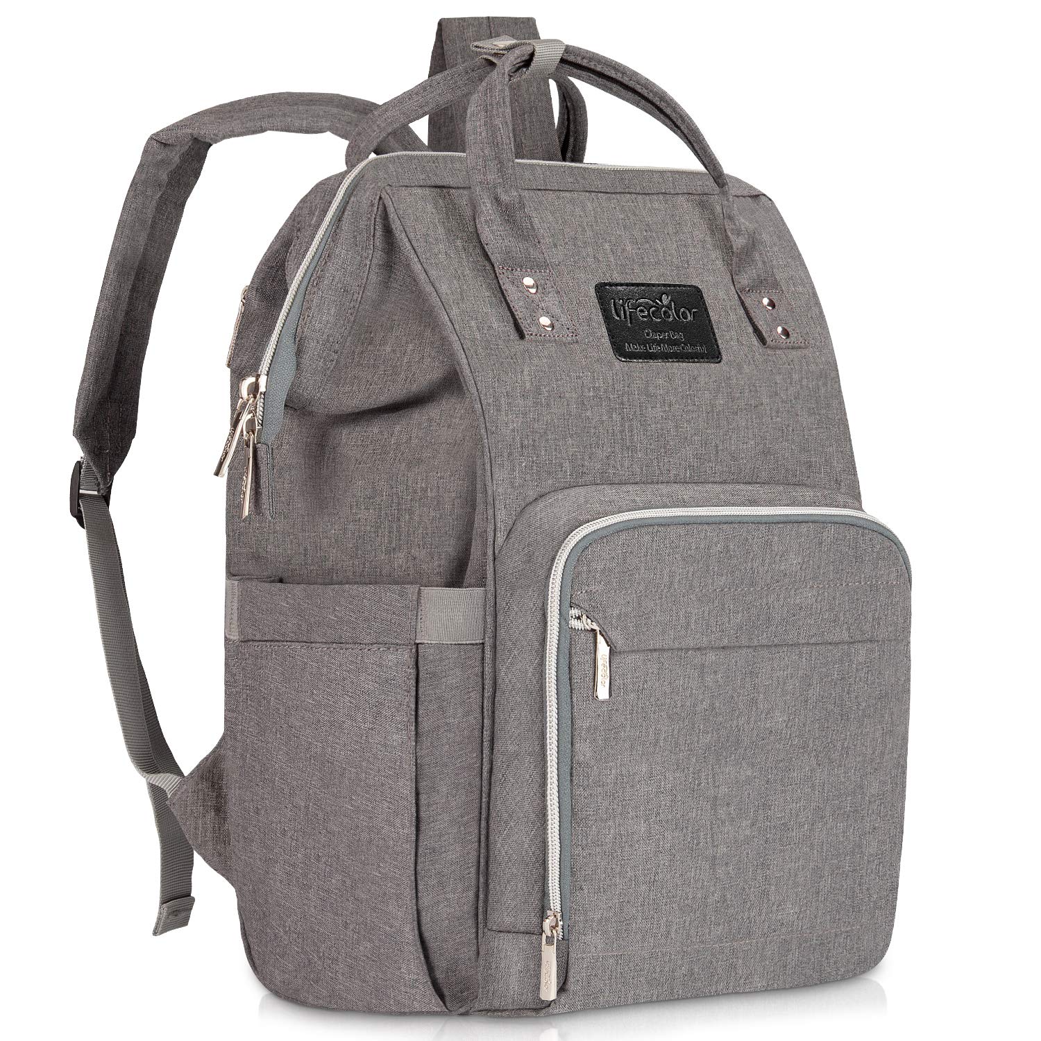 - Water-repellent polyester, easy wipe clean; Turn over the nappy bag