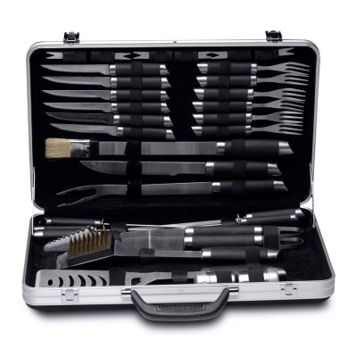 - Includes a salt cellar and pepper pot, 6 corncob holders, 6 steak forks, 6 steak knives, a barbeque knife, grill scraper, small brush, slotted turner, meat fork, 6 skewers, tongs, and a carrying case