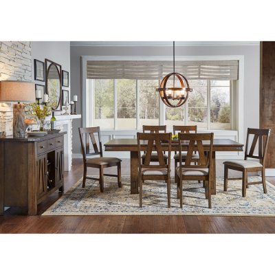 - Includes table with 18” self-storing Butterfly Leaf, Server and 6 Upholstered Stools