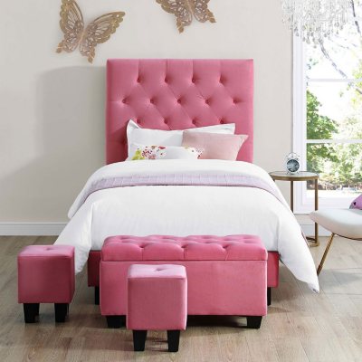 - Includes bed, storage bench and two small ottomans