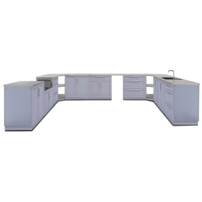 - (3) 2 Door Base Cabinet, (1) 33″ Insert grill cabinet , (3) 3 Drawer base cabinet, (2) 90 degree cabinet, (1) Bar cabinet, (1) Sink cabinet, (5) 32″ Stainless steel countertop, (1) 88″ Stainless steel countertop