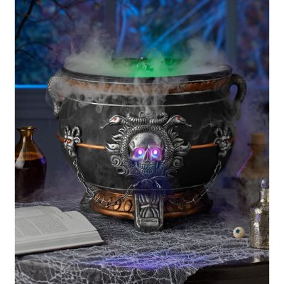 - Illuminated skull eyes on the front and back of the cauldron change colors