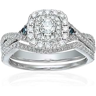 - 14K White Gold Bridal Ring set with Halo around the center, a matching wedding band in 3/4cttw