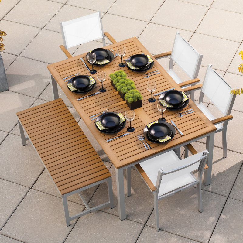 - Includes 1 rectangular dining table, 4 sling seat armchairs and 1 backless bench