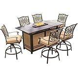 Hanover Traditions 7 Piece High-Dining Bar Set in Tan with 30,000 BTU Fire Pit Bar Tabl...