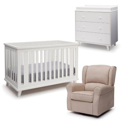 - Includes: crib, dresser, changing topper and glider