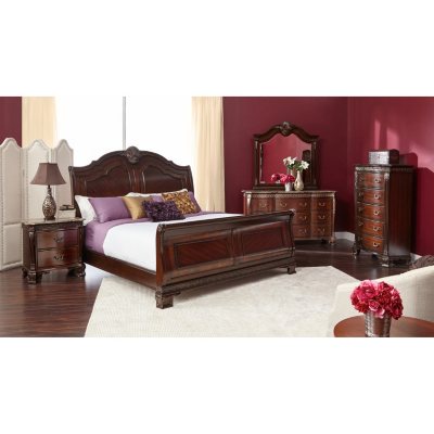 - Includes queen bed, dresser, mirror, chest and nightstand