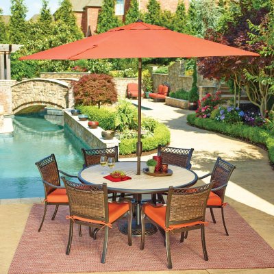 - Includes six fully woven dining and a slat-topped dining table