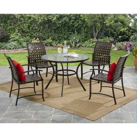- Includes includes four chairs constructed in straps with a powder-coated steel frame finish and one smoke glass tabletop table