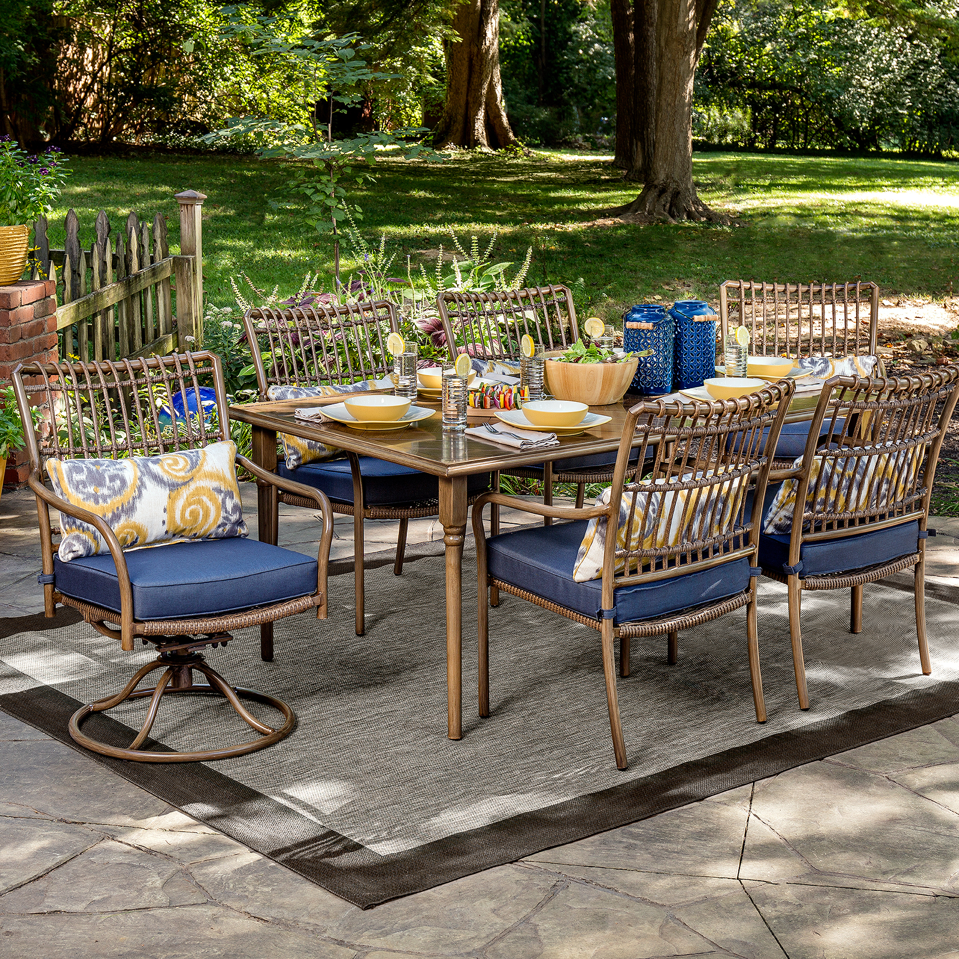 - Includes one rectangular dining table (68″ x 40″), four stationary dining chairs and two swivel rockers with lumbar pillows