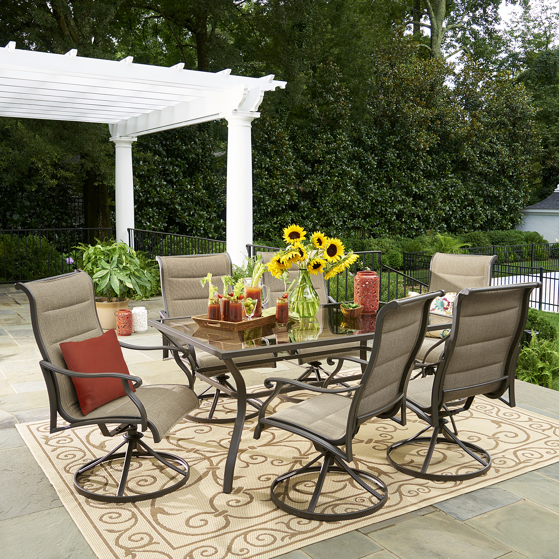 - Rust resistant powder coated aluminum frame, fiber filled cushions