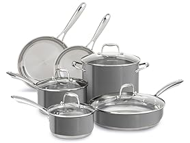 - Includes 8″ Skillet, 10″ Skillet, 1.5-Quart Saucepan with Lid, 3.0-Quart Saucepan with Lid, 3.5-Quart Saute Pan with Lid, 8.0-Quart Stockpot with Lid