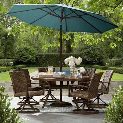 - Includes 60″ round dining table and six swivel rockers (padded wicker seats)