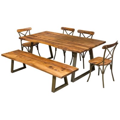 - Includes standard height dining table with huge single slab of kiln-dried rosewood, bench and 4 chairs