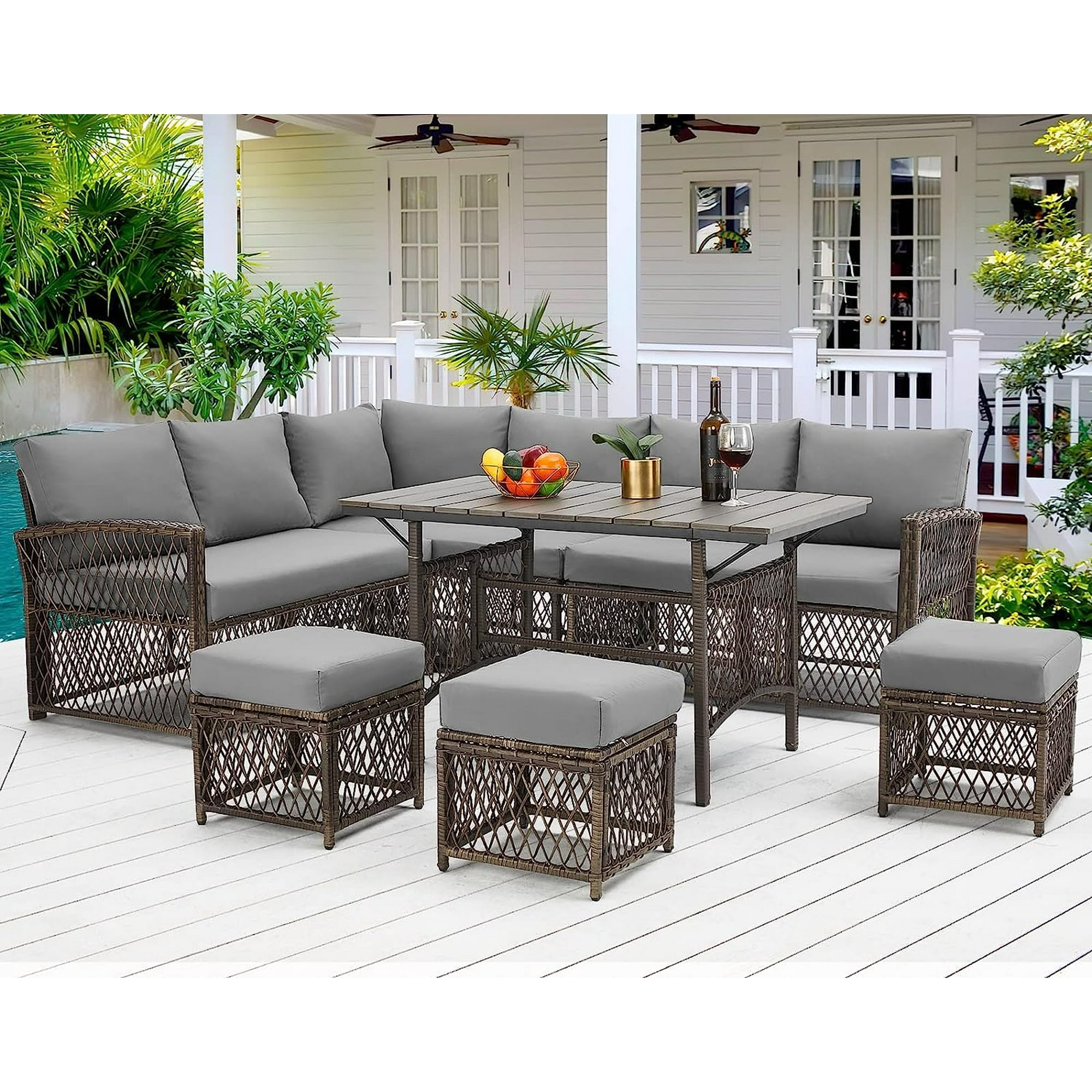- Handwoven all-weather wicker sectional and fire table with grouted porcelain