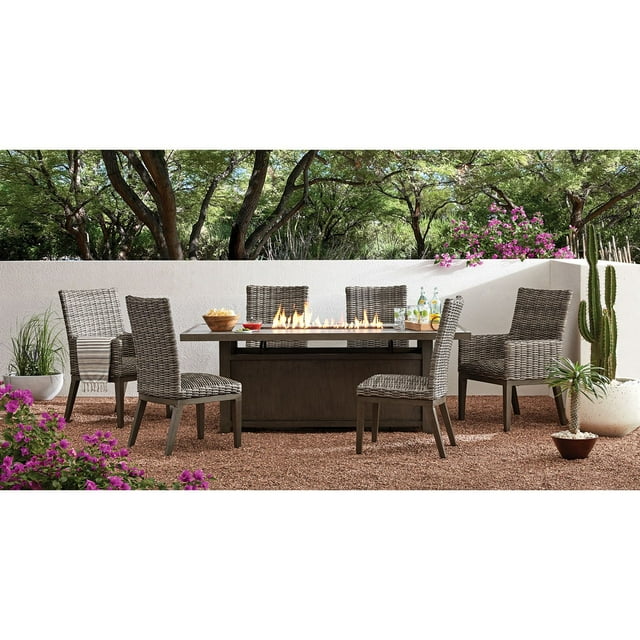 - Includes: 1 sofa, 2 deep seating chairs, 2 ottomans, 1 fire pit coffee table and custom covers, seats 5