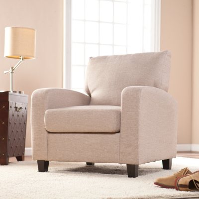 - Manufactured wood frame, espresso block legs, attached back cushions, padded swoop arms