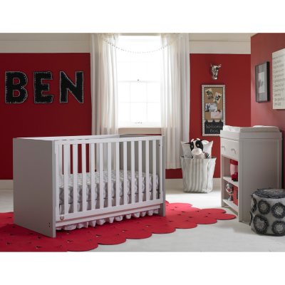 - Crib with 3-position adjustable mattress platform – Converts to toddler bed (guard rail not included) and daybed